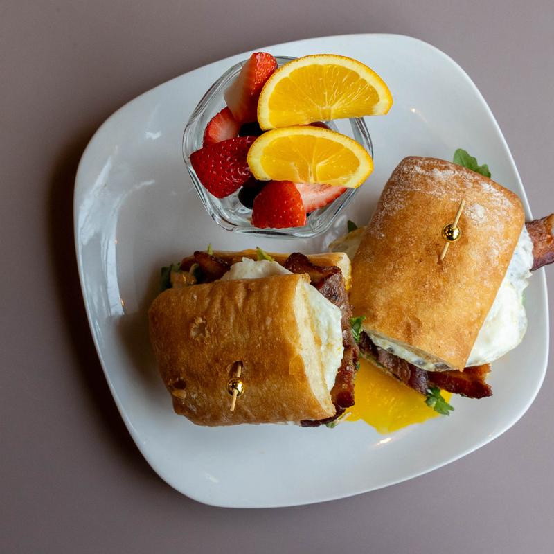 2 eggs & bacon on a grilled ciabatta lined w/ fresh smashed avocado, a touch of arugula & creamy sauce, served w/ a side cup of fruit.