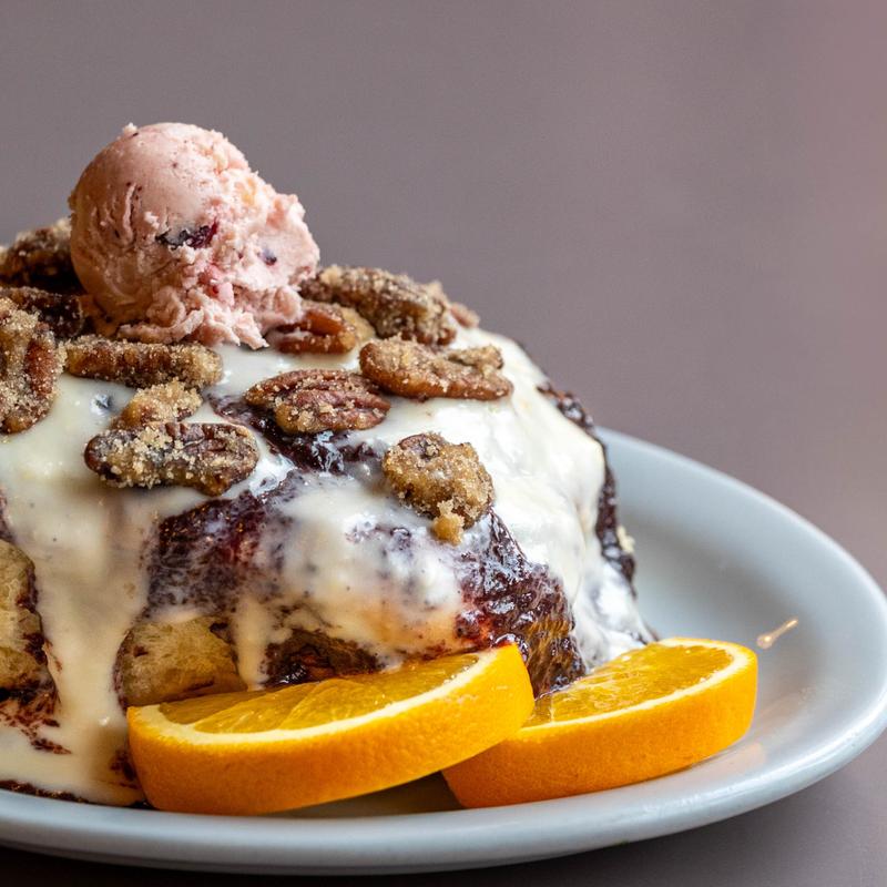 Our famous roll topped w/ huck compote, icing, candied pecans & huckleberry butter.