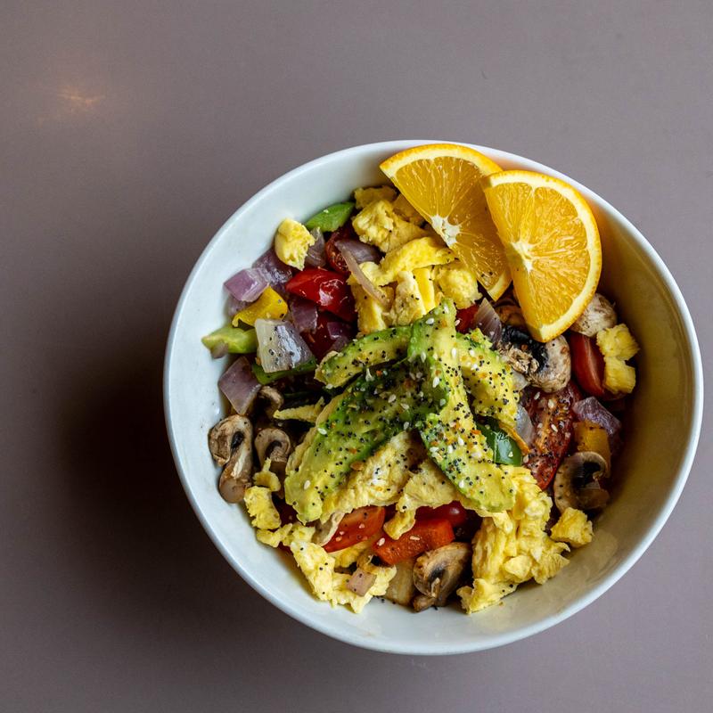 Hashbrowns layered under cheese, peppers, onions, spinach, mushrooms, tomatoes, 2 eggs & avocado.