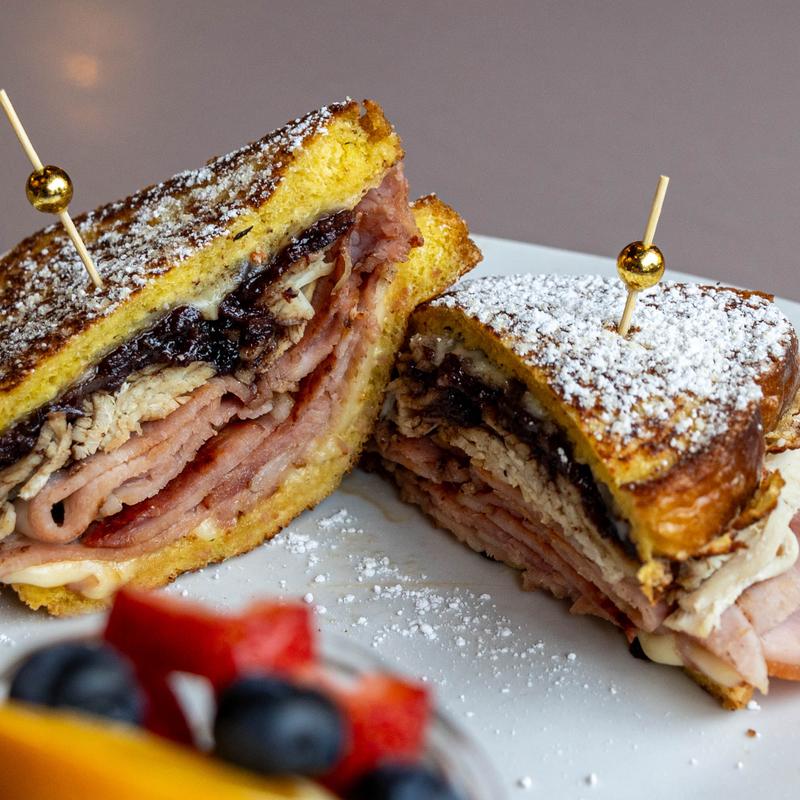 French toast grilled w/ ham, turkey & Swiss cheese, lined w/ huckleberry bacon jam & topped w/ powdered sugar, served w/ fruit.
