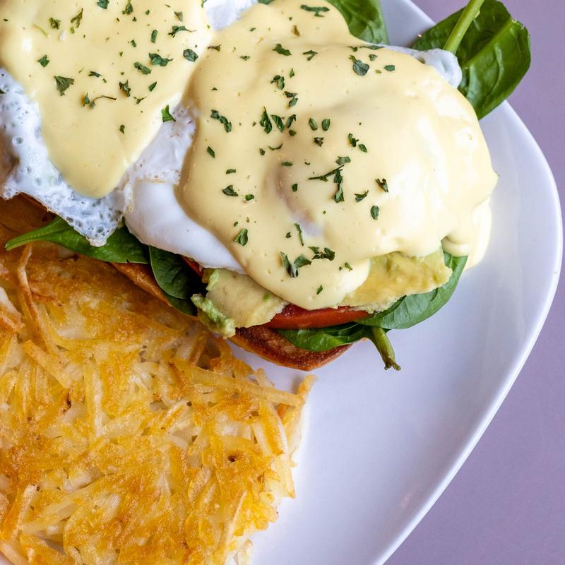 2 basted eggs on a croissant w/spinach, tomato & avocado topped w/ hollandaise sauce & side of hashbrowns.