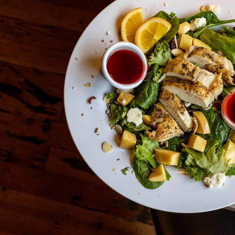 Romaine, spinach, cranberries, chopped apples, candied pecans, sunflower seeds, almonds, feta cheese & grilled chicken dressed w/ raspberry vinaigrette.